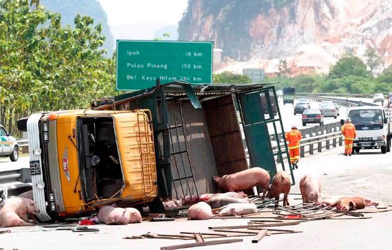 Pig Car Accident, 4 pigs die, 5 pigs wound, 16 pigs lost.